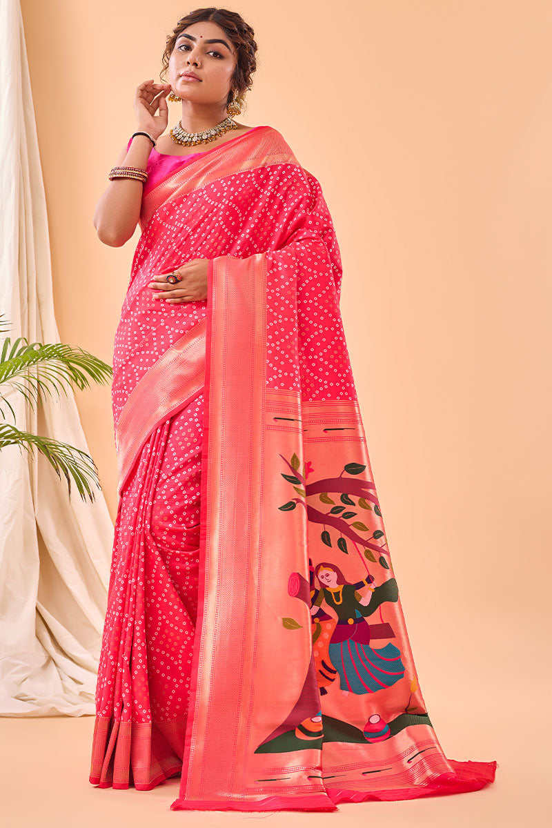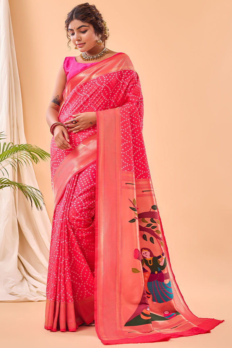 Bandhani pattern Paithani sarees are exquisite examples of traditional Indian craftsmanship, blending two distinct techniques to create a mesmerizing textile masterpiece. Paithani sarees, originating from the town of Paithan in Maharashtra, are renowned for their rich history and intricate designs, often featuring motifs inspired by nature and mythology. The addition of the Bandhani pattern, a tie-dyeing technique practiced mainly in Rajasthan and Gujarat, elevates these sarees to a whole new level of elegance and allure.