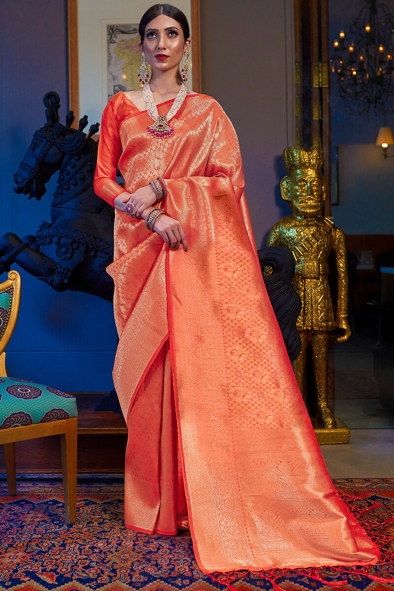 Be the delightful surprise in a stunning, shocking orange Kanjivaram silk saree. This saree is glamorous and elegant, created with care and skill. Feel the delicate texture of the fine silk sliding smoothly over your skin. Make a statement and look your best with this vibrant and luxurious saree.| Marketing and Sold By | Armima |