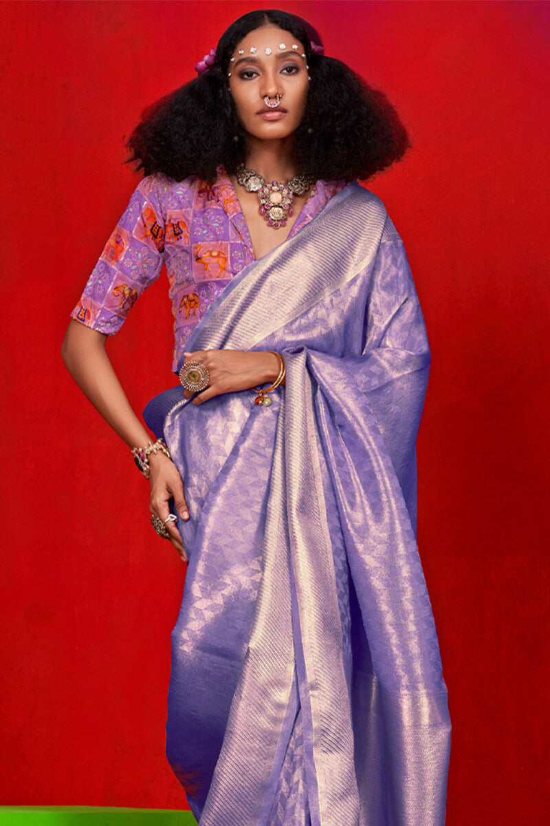 Soft as a whisper and cool as twilight, the Frosted Lavender Banarasi Tissue Silk Saree brings a dreamy aura to life. Its pastel tone is enhanced by intricate zari patterns that flicker like frost on silk. Ideal for evening soirées, it drapes like a poem wrapped in elegance.