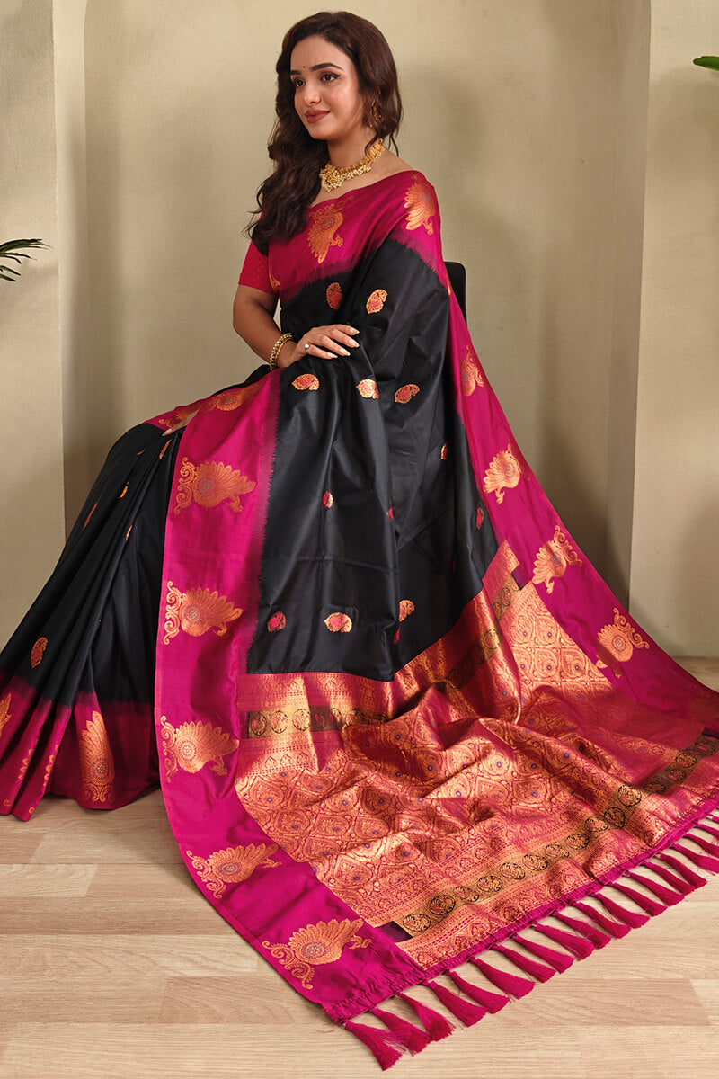 Oil Black Soft Banarasi Silk Saree With Chaap Border