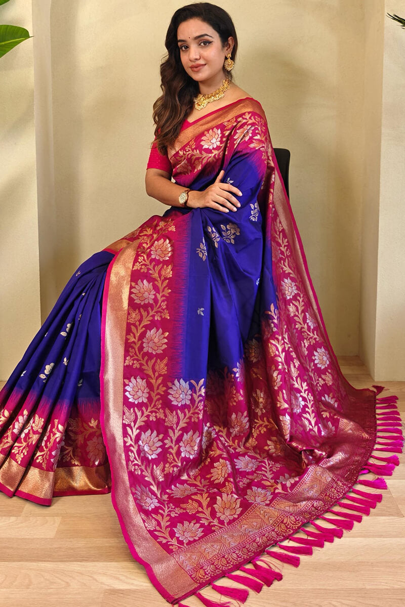 The Persian Blue Banarasi Silk Saree is an ode to elegance steeped in history. The rich blue fabric is accentuated by an intricately woven chaap border, resulting in a graceful ensemble ideal for evening occasions and festive moments.