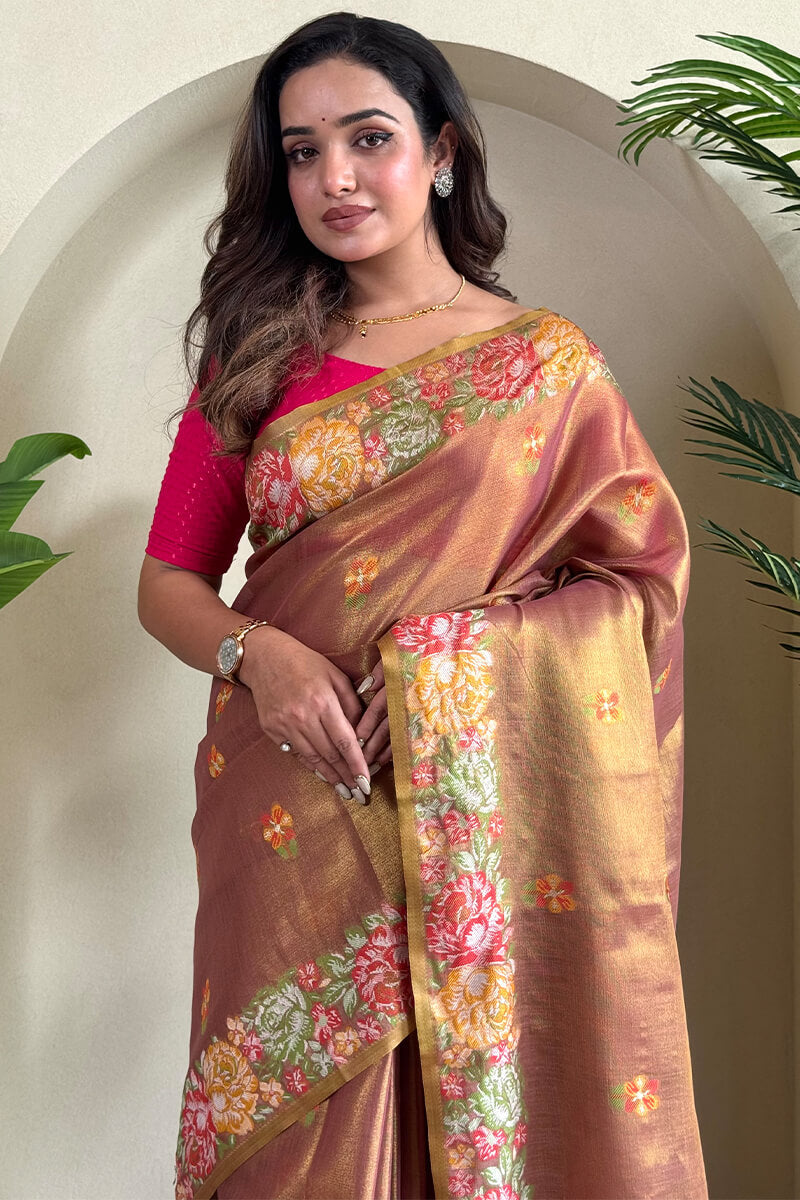 Bold yet beautifully grounded, the Sanguine Brown Tissue Silk Saree reflects confidence through its deep, rich hue. Woven with precision, this saree captures the essence of modern luxury while staying rooted in tradition. Ideal for evening affairs, its velvety texture and warm undertones add a sense of depth and poise, making it a statement piece for the woman who commands presence.