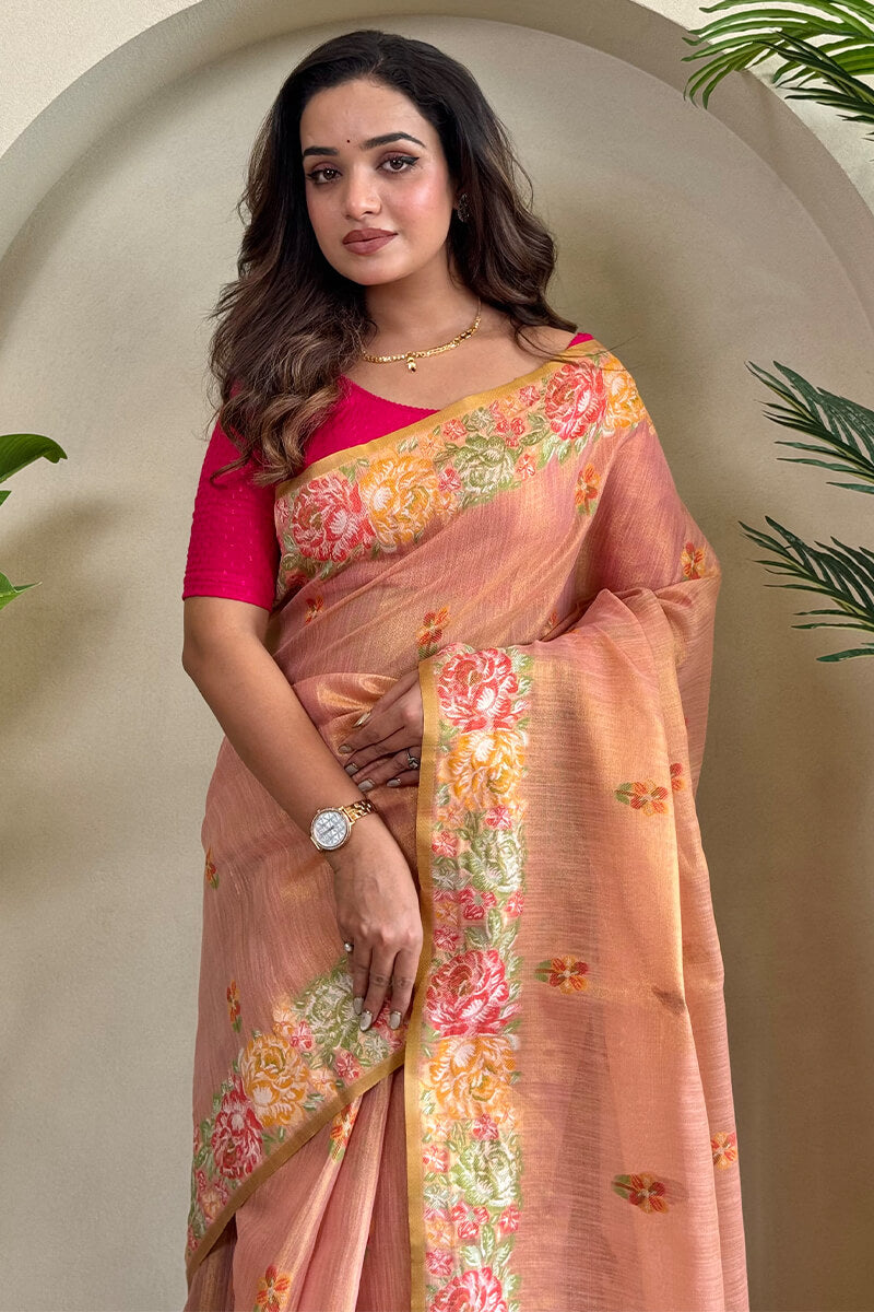 As tender as the blush of a rose, the Sweet Pink Tissue Silk Saree is crafted for moments that deserve soft beauty. The gentle pink shade, paired with the gossamer texture of tissue silk, creates an ensemble that feels like a dream. Ideal for bridal showers, anniversaries, or serene morning events, this saree captures the poetry of femininity in every fold.