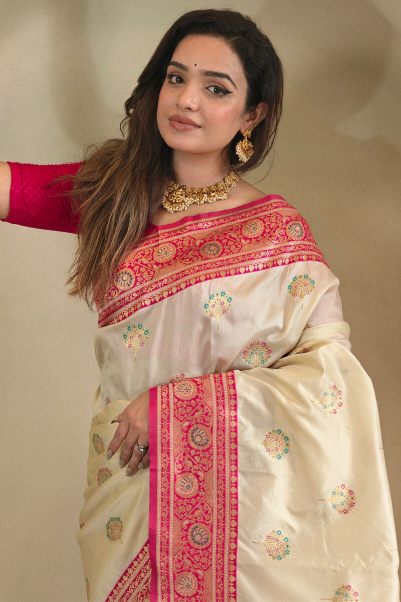 Understated yet luxurious, the Timber Beige Banarasi Silk Saree is a lesson in classic sophistication. Woven with rich Banarasi artistry, the warm neutral hue enhances the golden zari motifs, making it a versatile piece for both daytime events and evening occasions. A graceful choice for those who admire quiet elegance.