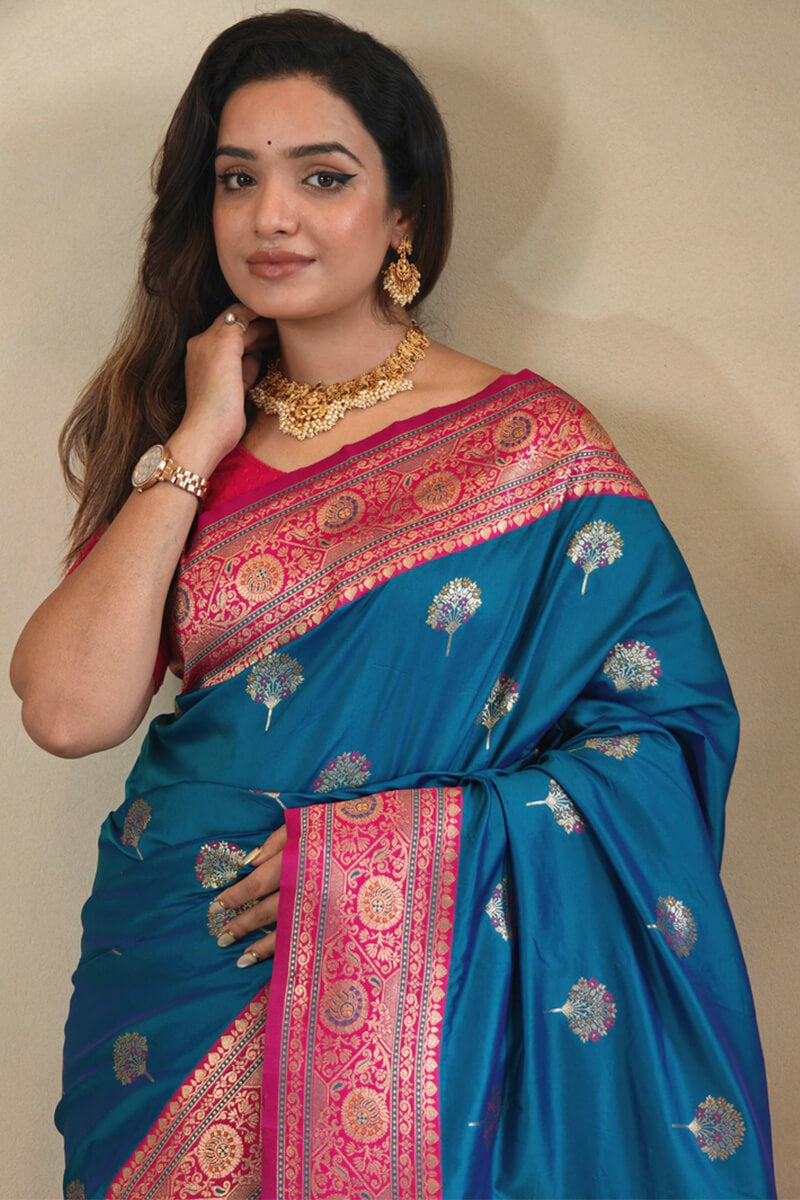 Drenched in a deep Yale Blue, this Banarasi Silk Saree is a portrait of modern royalty. The intricate gold-toned motifs weave stories of tradition across a sea of serene blue, creating a statement piece that blends age-old craftsmanship with contemporary appeal.