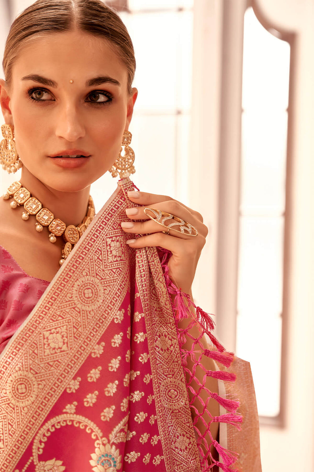 Flamingo Pink Banarasi Satin Silk Saree