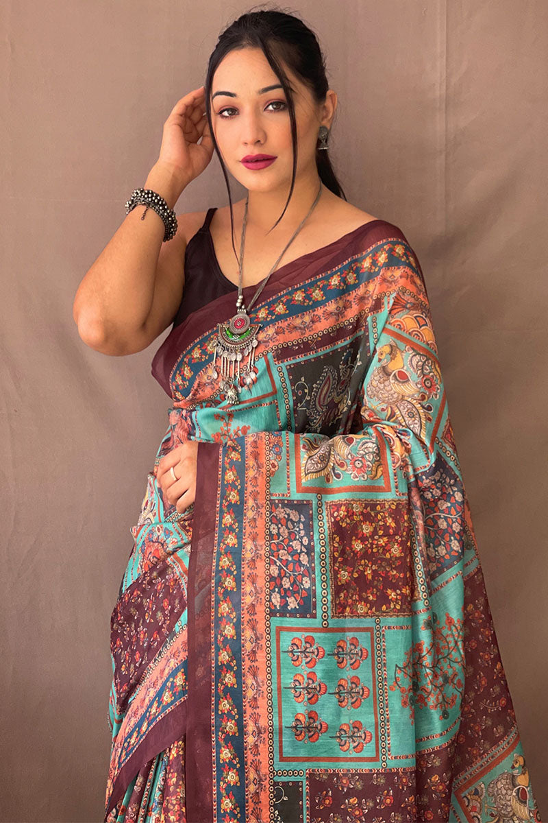 Moonstone Blue Kalamkari Printed Cotton Saree