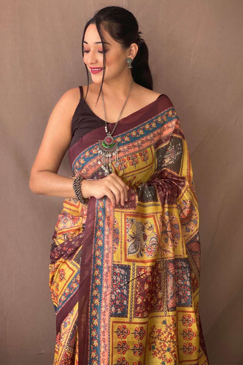 Radiate warmth and grace in our Mustard Yellow Kalamkari Printed Cotton Saree. Like a burst of sunshine, this saree captivates with its vibrant hue and intricate Kalamkari motifs. The mustard yellow color symbolizes vitality and joy, making it perfect for any festive occasion or celebration.- Fabric :- Cotton Silk