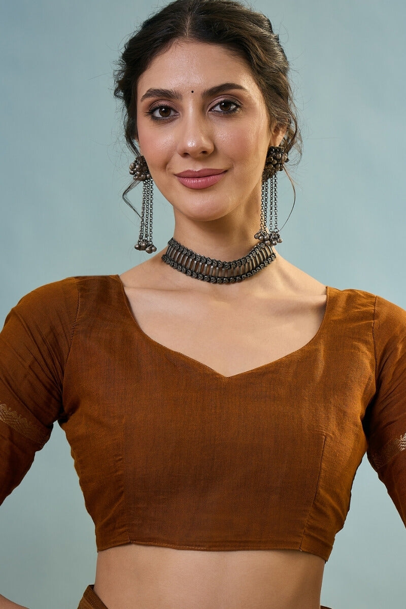 Mustard Brown Printed Cotton Saree with Zari Woven Border