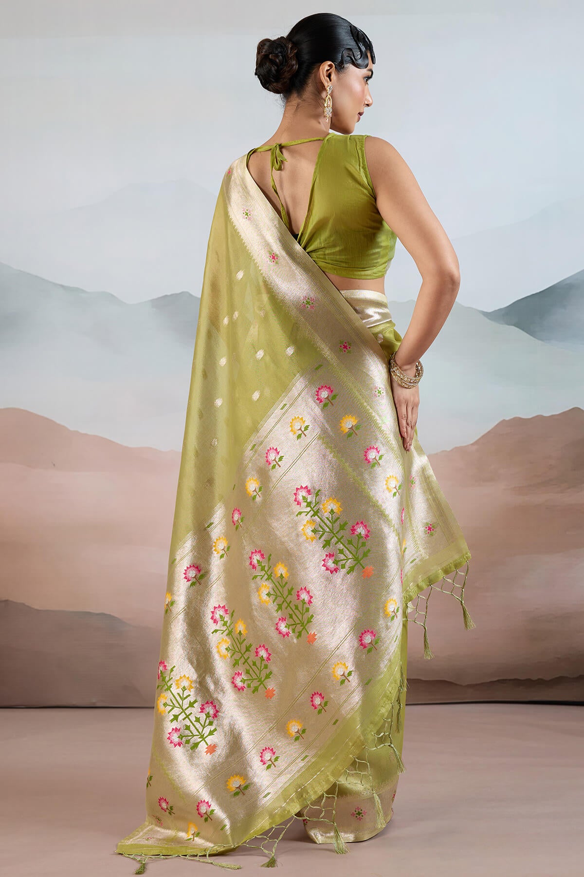 The designs of Paithani tissue silk sarees draw inspiration from nature, mythology, and classical art. Traditional motifs such as peacocks, lotus flowers, and vines are woven into the fabric, each carrying symbolic meaning. The luminous tissue silk base enhances these motifs, giving them a graceful depth that reflects centuries of storytelling through thread.