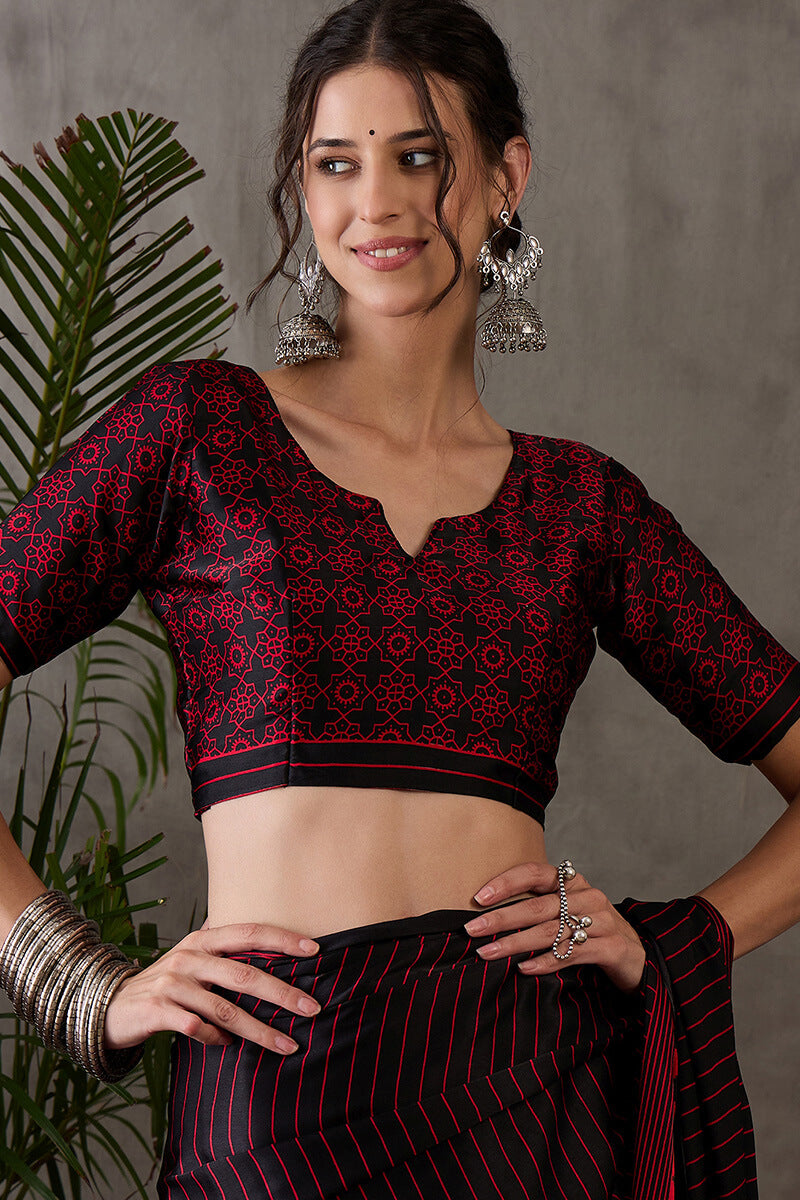 Eclipse Black Ajrakh Printed Satin Silk Saree