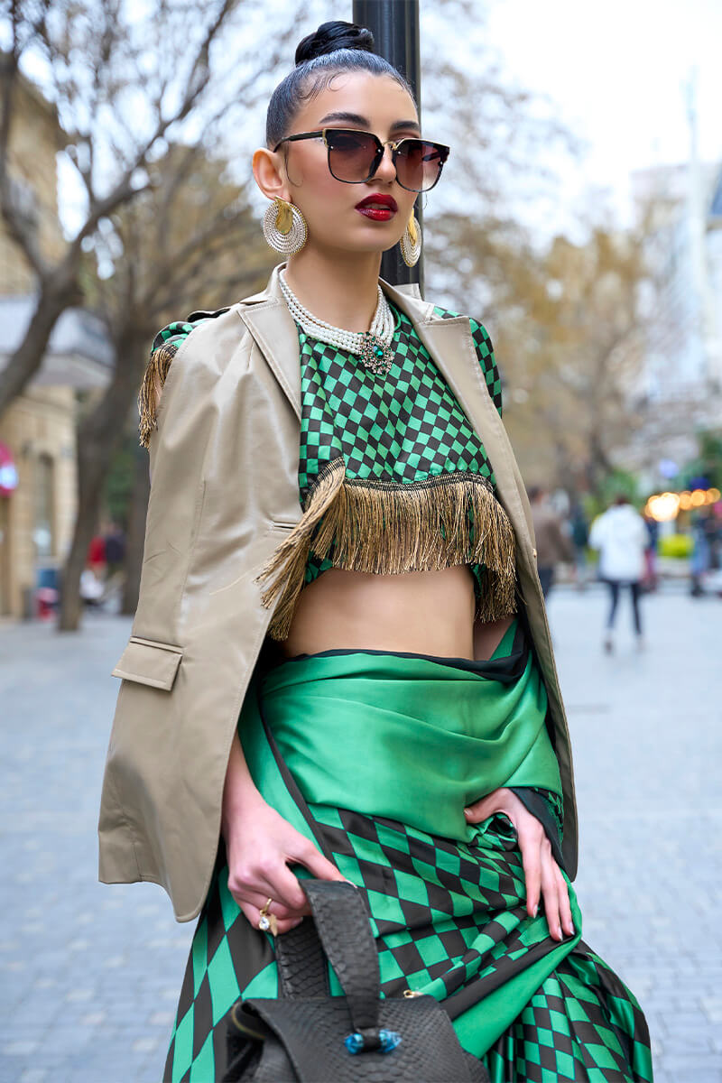 Drenched in the regal hues of Persian Green, this digital printed satin silk saree exudes an air of royalty and sophistication. The satin silk fabric, with its opulent sheen and graceful drape, becomes a symbol of luxurious indulgence. The digital prints, inspired by Persian artistry, tell a tale of opulence and cultural richness.