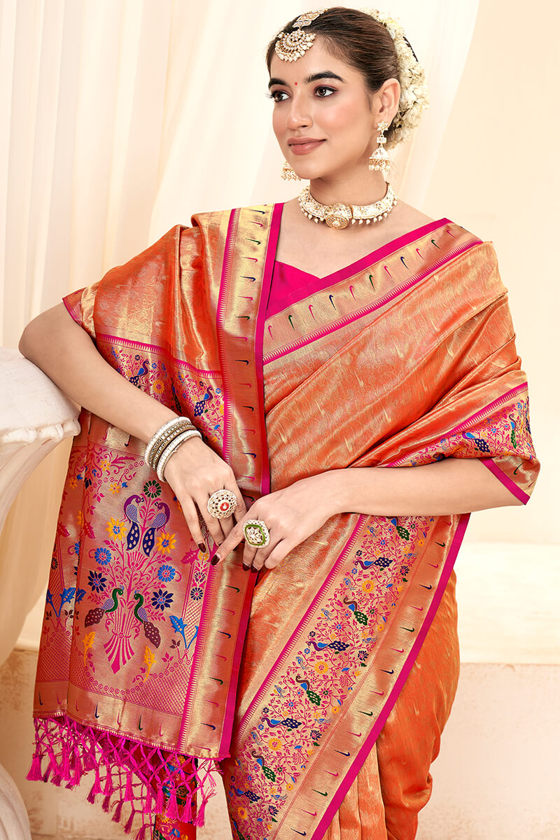 Set hearts ablaze with the mesmerizing beauty of the Burning Orange Paithani Tissue Silk Saree. Radiating warmth and vibrancy, this saree is a celebration of boldness and confidence. The fiery orange hue symbolizes passion and energy, while the intricate Paithani weaving adds a touch of traditional allure. Whether it's a festive occasion or a joyous celebration, this saree will make you the center of attention, exuding elegance and charm with every move you make.