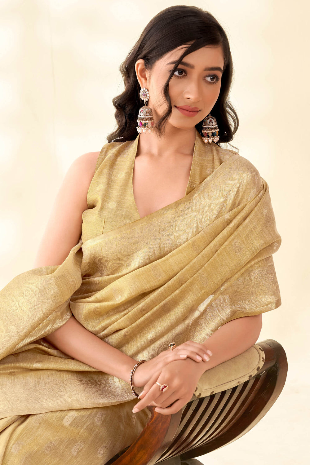 Embrace subtle charm with the Desert Beige Tissue Linen Silk Saree. The soft neutral hue enhances your natural elegance, while the lightweight tissue-linen silk ensures a flowing drape. Perfect for office celebrations, brunches, and casual festive occasions.