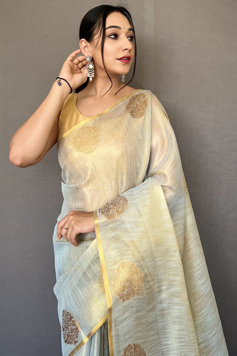 Make a statement with our French Grey Zari Woven Tissue Silk Saree, a masterpiece of understated elegance and sophistication. The chic grey hue exudes a sense of effortless charm and refinement, while the intricate zari work adds a touch of luxury. Whether it's a formal gathering this saree is sure to turn heads and leave a lasting impression.- Fabric :- Tissue silk