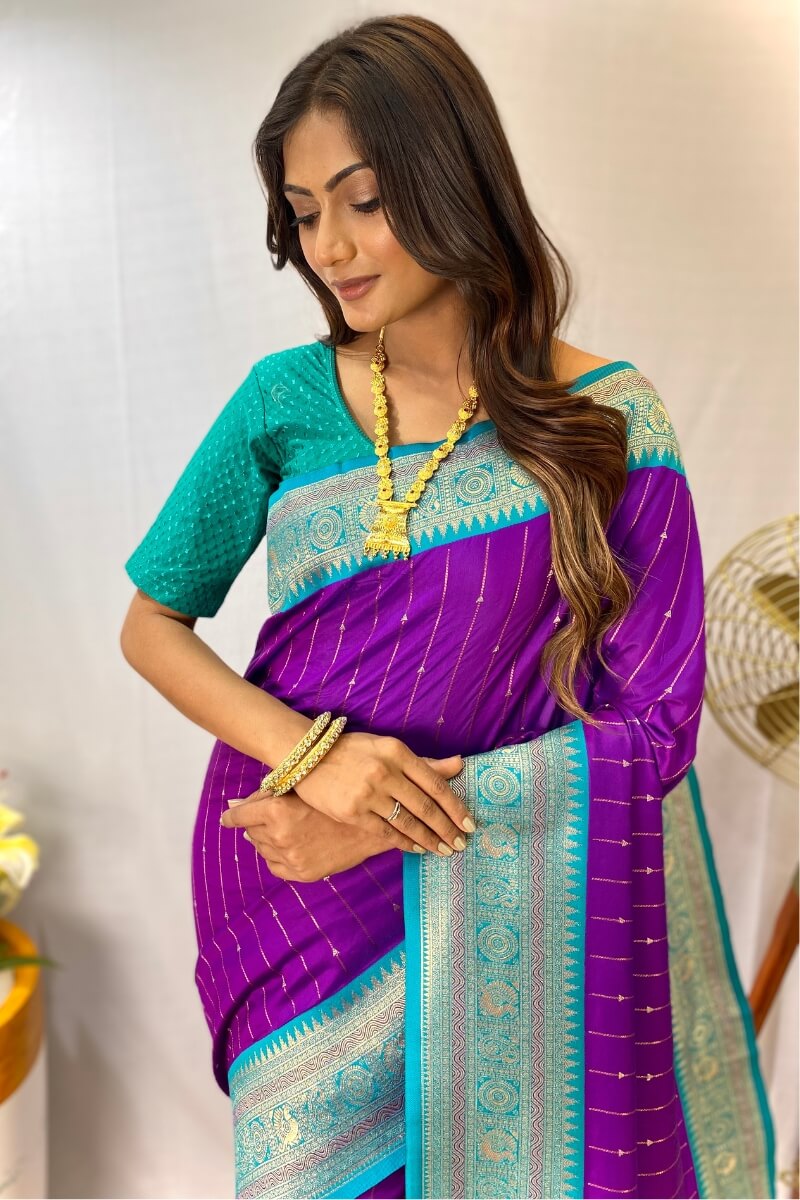 Rich, regal, and absolutely mesmerizing, the Barney Purple Zari Woven Banarasi Silk Saree is designed to make an unforgettable impression. The deep purple fabric, coupled with its delicate zari patterns, is the perfect representation of royal sophistication and cultural heritage. Intricate motifs flow seamlessly across the fabric, creating a dynamic visual appeal.