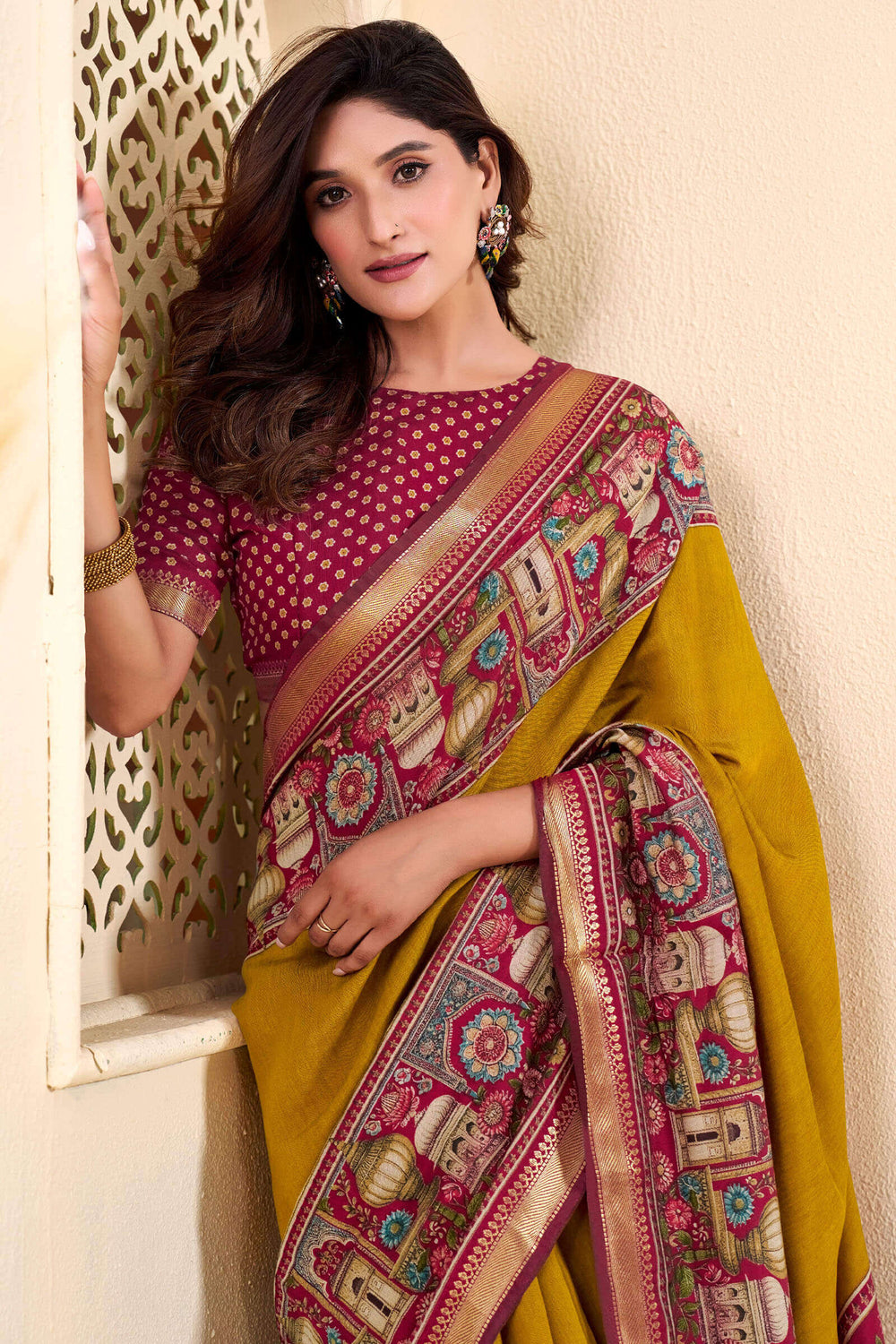 Infuse warmth and elegance into your wardrobe with the Dark Mustard Printed Mul Cotton Silk Saree. The rich mustard tone, adorned with delicate prints, creates a striking balance of tradition and contemporary style. Soft and lightweight, this saree drapes effortlessly, making it perfect for festive occasions or stylish daytime events.