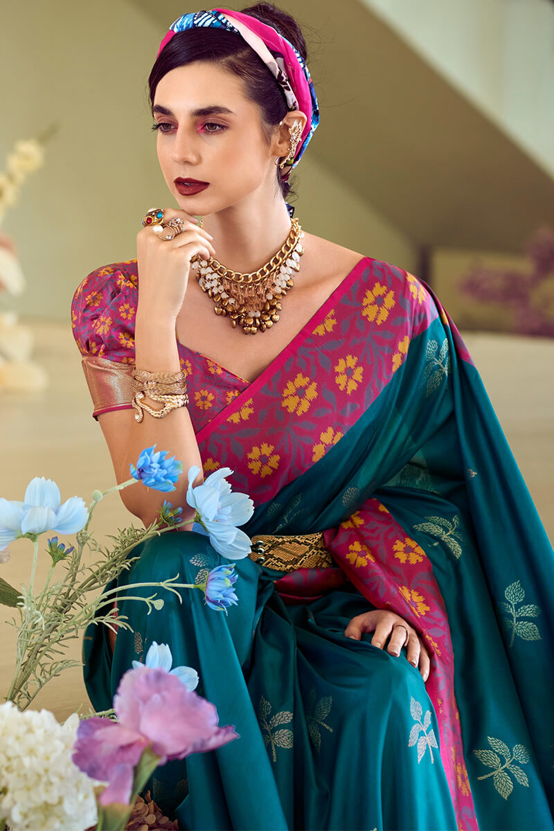 Deep Sea Blue Soft Silk Saree with Ikkat Border