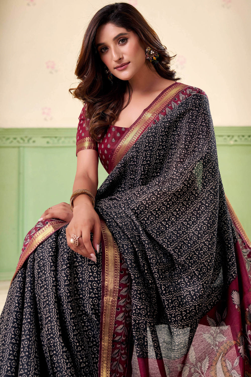 Make a statement in timeless elegance with the Rich Black Printed Mul Cotton Silk Saree. Its deep black shade, contrasted with striking printed motifs, exudes confidence and grace. Perfect for evening events, festive celebrations, or formal gatherings, this saree promises both style and sophistication.